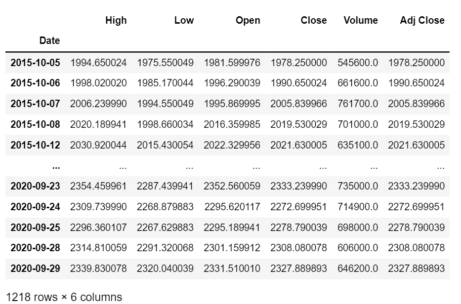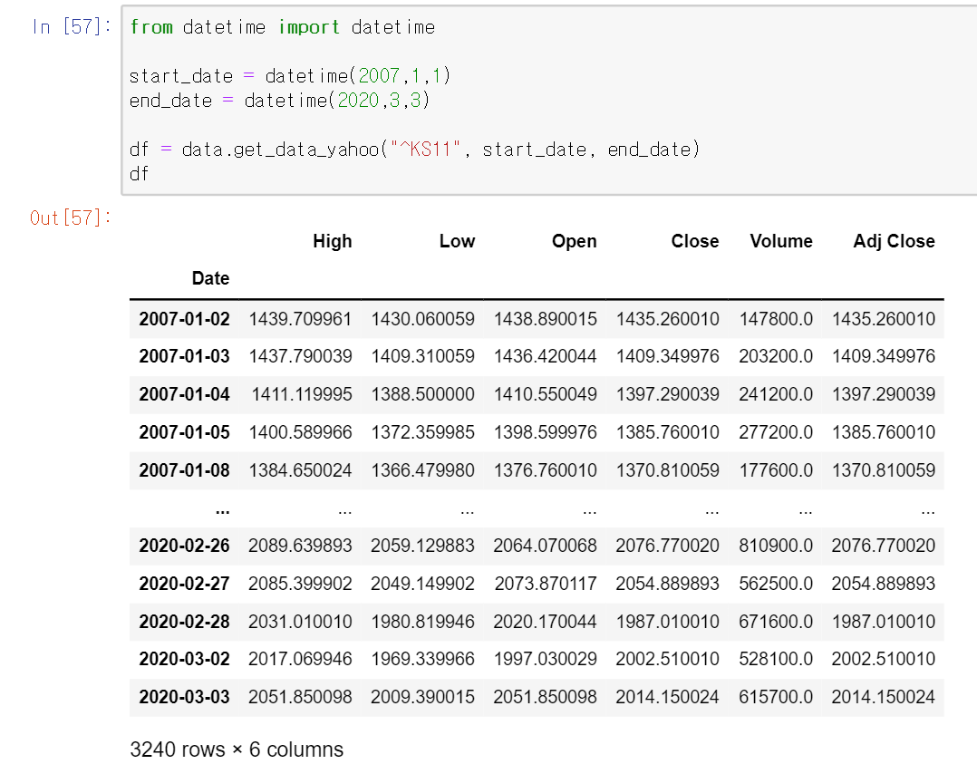 고가, 저가, 시초가, 종가, 거래량, 수정 주가 순서대로 데이터가 날짜별로 출력되는 것을 확인할 수 있습니다.