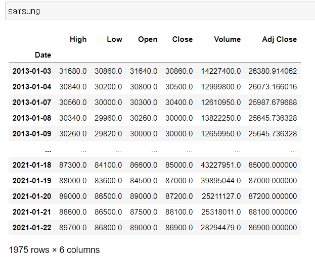 samsung = samsung.reset_index() # Date index를 Column으로 보내주기 위함
