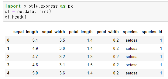 기본 데이터는 plotly에 iris 데이터가 저장되어 있으니 불러와서 사용하도록 합니다.