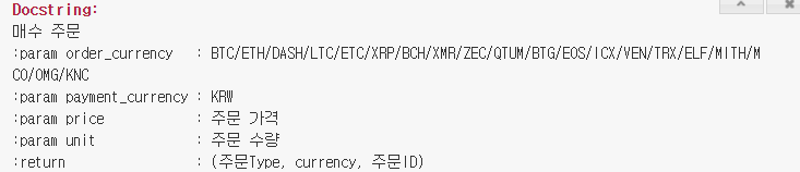 return에 나와있듯 주문type, 주문코인명, 주문ID, 지불 화폐 순서로 출력된다.