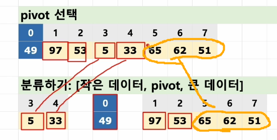 - 기준점(pivot이라 부름)을 정해서, 기준점보다 작은 데이터는 왼쪽, 크면 오른쪽으로 모으는 함수를 작성한다.