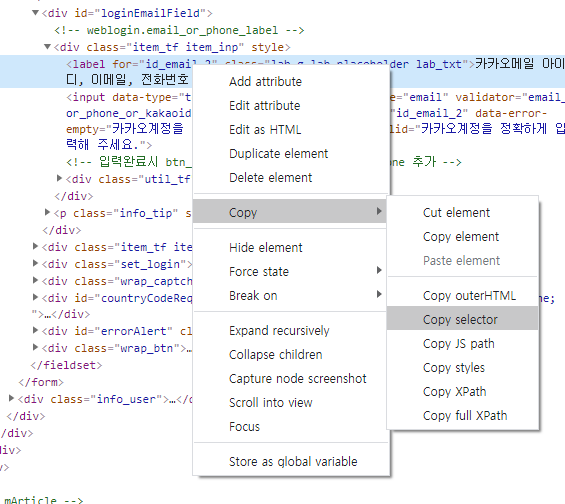 원하는 위치에서 우클릭 -> Copy -> Copy selector 를 통해서 css selector를 통한 해당 element의 위치를 찾을 수 있습니다.