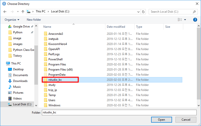 저는 C 드라이브에 rstudio_bc라는 폴더를 생성해서 해당 위치를 기본 디렉토리로 설정하였습니다. ! 주의 ! 폴더명 꼭 영문인 것 기억해주세요.