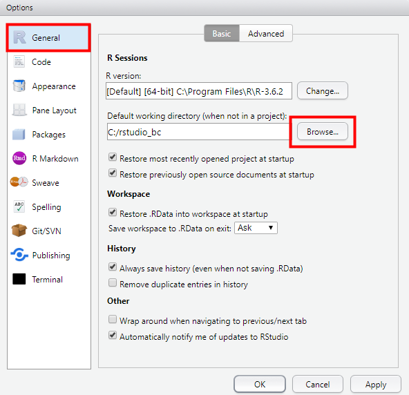 General 탭에서 Deault working directory 부분을 확인해주세요. Browse를 눌러 원하는 위치에 기본 workspace를 구성해주세요. 파일이 떠돌아 다니지 않게 R만을 위한 workspace를 지정해주면 좋겠죠?