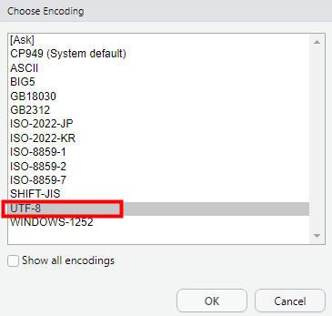 Code - Saving - Default text encoding 탭을 확인해주세요. Change를 눌러서 UTF-8을 선택해주세요.
