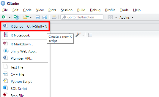 Ctrl + Shift + N 또는 왼쪽 상단의 +버튼을 눌러 R Script를 눌러주세요. 새로운 Script가 생성될 것입니다. Console에서는 바로 실행되고 코딩하기에 불편하므로 Script에 코드를 작성하고 실행하는 것이 용이합니다.