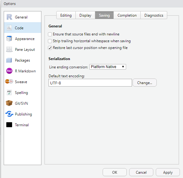 General 탭에서 Deault working directory 부분을 확인해주세요. Browse를 눌러 원하는 위치에 기본 workspace를 구성해주세요. 파일이 떠돌아 다니지 않게 R만을 위한 workspace를 지정해주면 좋겠죠?