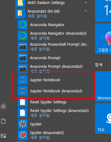 시작 폴더에서 Anaconda3 폴더를 찾아가면 Jupyter Notebook을 확인할 수 있습니다.