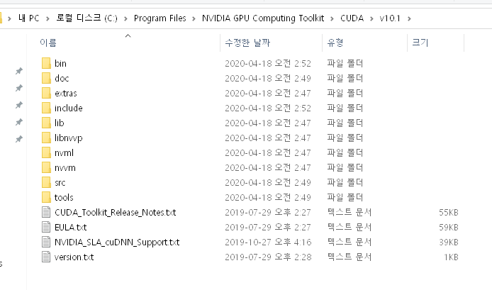 - 내pc > c드라이브 > 프로그램파일 > NVIDIA GPU Computing Toolkit > CUDA > 10.1 로 이동해줍니다.