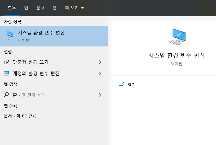시스템 환경 변수 편집으로 들어가줍니다.