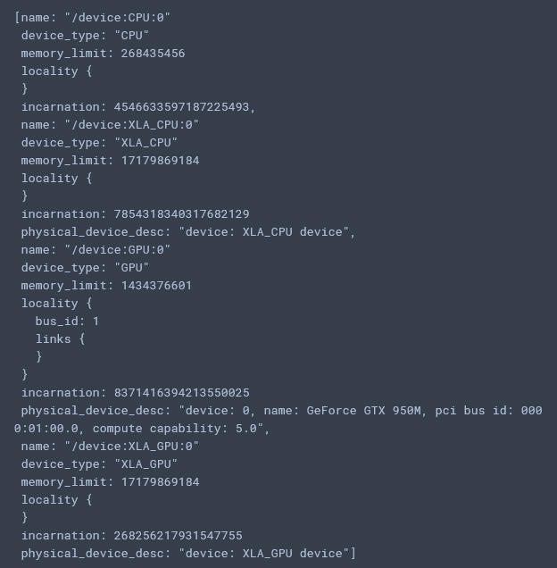 저의 결과는 아래 이미지와 같이 나왔습니다. 자세히 보면 device_type이 나와있습니다. CPU 뿐만 아니라 GPU가 나오는지 확인해 주시면 되겠습니다.