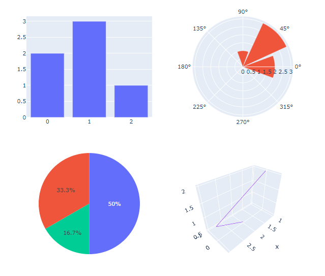 "xy": 2D Cartesian subplot type for scatter, bar, etc. This is the default if notypeis specified."scene": 3D Cartesian subplot for scatter3d, cone, etc."polar": Polar subplot for scatterpolar, barpolar, etc."ternary": Ternary subplot for scatterternary."mapbox": Mapbox subplot for scattermapbox."domain": Subplot type for traces that are individually positioned. pie, parcoords, parcats, etc.