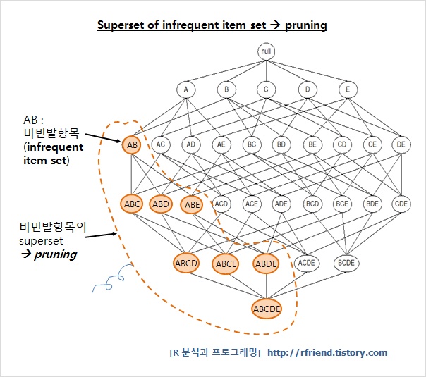 - 비빈발(infrequent)에 해당하는 모든 부분 집합에 대한 연산을 제외한다. -> 가지치기(pruning )