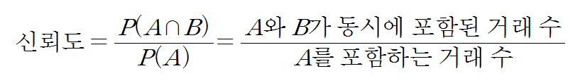 신뢰도(Confidence) : 항목 X를 포함한 거래 중에서 항목 X와 항목 Y가 같이 포함될 확률, 조건부 확률과 비슷하다. 연관성 정도를 파악할 수 있다.