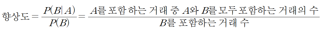 향상도(Lift) : X가 주어지지 않고, Y의 확률에 대한 X가 주어졌을 때의 Y의 확률의 증가 비율