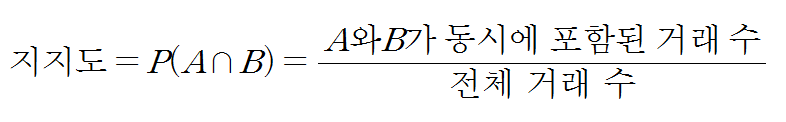 지지도(Support) : 전체 거래 중 항목 X와 Y를 동시에 포함하는 거래의 비율