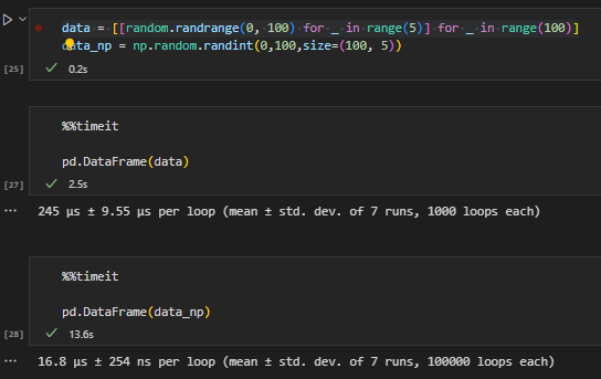 똑같이 100행 5열 데이터를 만들어서 DataFrame으로 만드는 작업만 속도를 측정해 보아도 쉽게 알 수 있습니다.