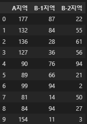 df = pd.DataFrame(data, columns=['A지역', 'B-1지역', 'B-2지역'])