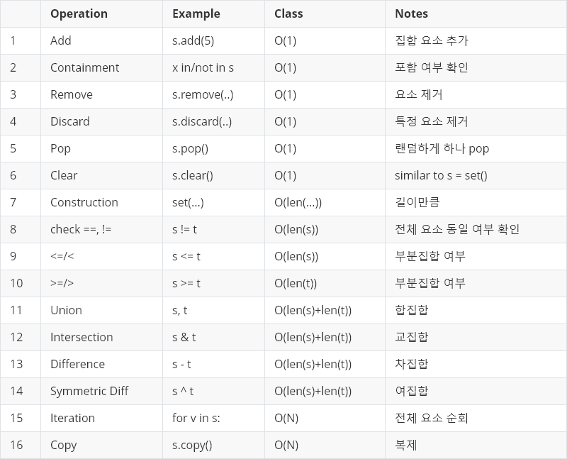 | 12 | Intersection | s & t | O(len(s)+len(t)) | 교집합 |