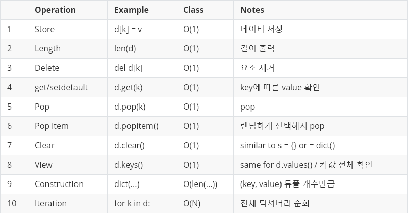 | 4 | get/setdefault | d.get(k) | O(1) | key에 따른 value 확인 |