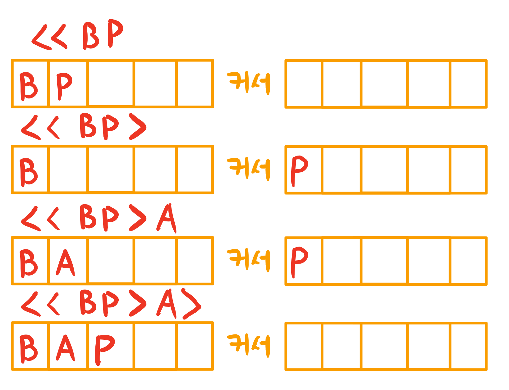 index = 0으로 둔 다음 앞뒤로 움직일 때마다 앞 뒤로 움직이는 방식으로 진행하는 방식을 가장 먼저 생각할 수 있습니다. 즉, 시뮬레이션 방식입니다. 하지만 그렇게 구현하면 시간 복잡도가 높아져서 시간이 오래 걸립니다. - 문자열을 그대로 두고 커서를 움직이는 것 => 일반적인 생각 => 문제가 해결되지 않는다 => 발상의 전환이 필요하다.