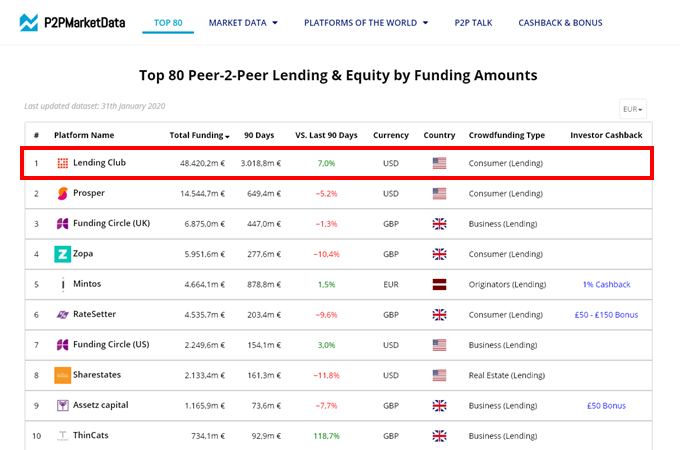 LendingClub은 세계 최대의 P2P 대출 플랫폼입니다. 이 회사는 2015 년 12 월 31 일까지 플랫폼을 통해 1,598 억 달러의 대출이 시작되었다고 주장했다. [출처 : 위키피디아]
