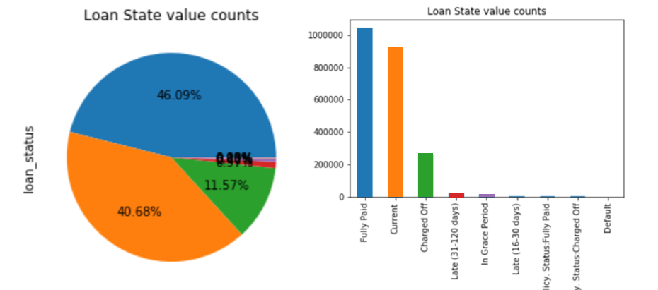 약 40%의 현재 진행 중인 대출건이 있습니다. 일부 분석에서는 Current상태의 대출을 Good Loan으로 분류하는 경우가 있습니다. 저의 경우는 대출을 해준 후, 잘 돈을 갚을 것인지가 궁금한 것이기 때문에 현재 진행 중인 데이터를 결과 데이터로 사용하지 않을 것입니다. 오히려 예측 모델을 잘 만들면 현재 진행 중인 대출에 대해서 끝이 Fully Paid로 끝날 것인지 Charged Off될 것인지를 예측하는 새로운 모델을 만들어 보는 것도 좋을 것 같아 보입니다.