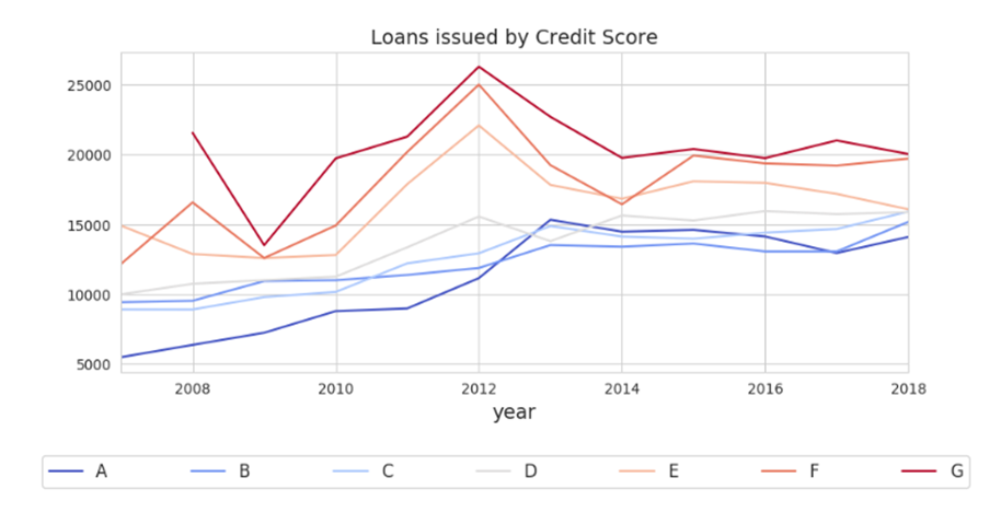 간단하게 생각할 수 있는 것은 2007년에서 2009년까지는 경제 위기로 인해서 기관에서 대출을 할 수 없었을 확률이 높습니다. 그러므로 높은 금리로 P2P 대출을 진행했을 것이라 예측합니다. 하지만 그 이후에 대해서는 사실 잘 모르겠습니다. 해당 부분에 대해서도 더 알아보면 좋을 것 같습니다.