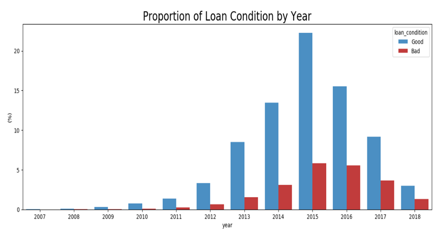 위의 그래프를 통해서 앞으로의 대출 예상 방식을 고민해볼 필요가 있을 것 같습니다. 먼저 전체 데이터를 통해서 예측을 진행하는 방법도 있을 것입니다. 또는, Current인 데이터가 없는 연도에 대해서만 타깃 해서 데이터를 분석하는 방법도 있겠습니다. 그 이유는 Current 대출의 끝 상태를 아직 알 수 없기 때문입니다. 완전히 결과가 나온 연도에 대해서 분석하는 것이 좋을 수도 있겠습니다.