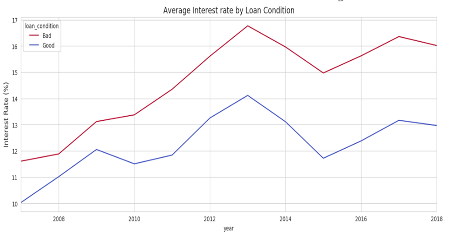 각 신용 등급에 따른 이자 비율을 확인해보았습니다. 신용등급이 낮을수록 이자 비율이 높은 것을 확인할 수 있습니다. 이를 연도별로 보아도 항상 낮은 신용등급이 더 높은 이자율을 가지는 것을 확인할 수 있습니다.
