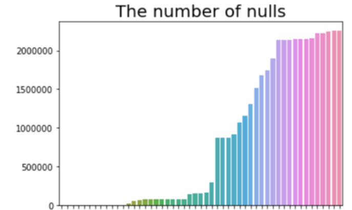 데이터의 결측치를 bar plot으로 확인한 결과입니다. 일부 데이터들의 결측치가 매우 많은 것을 확인할 수 있습니다. 각 feature들의 결측 값을 어떻게 채울 것인지에 대한 고민이 필요할 것으로 보입니다.