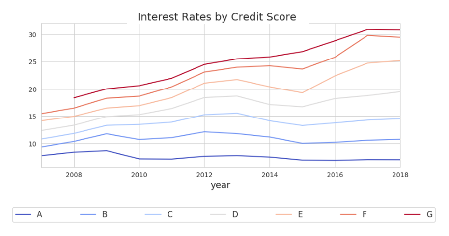 전체적으로 평균 이자율이 높아지는 것을 확인할 수 있습니다. 이자율이 높아진 다는 것이 상당히 흥미로운 부분입니다.