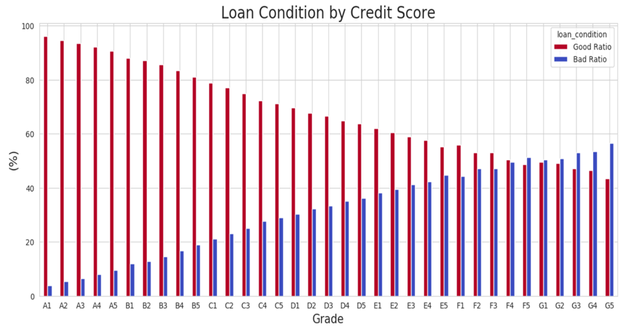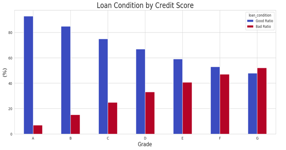각 신용 등급에 따라 대출 상태의 비율을 확인해 보았습니다. 신용 등급이 높을수록 확실히 대출 상환율이 높은 것을 확인할 수 있습니다.