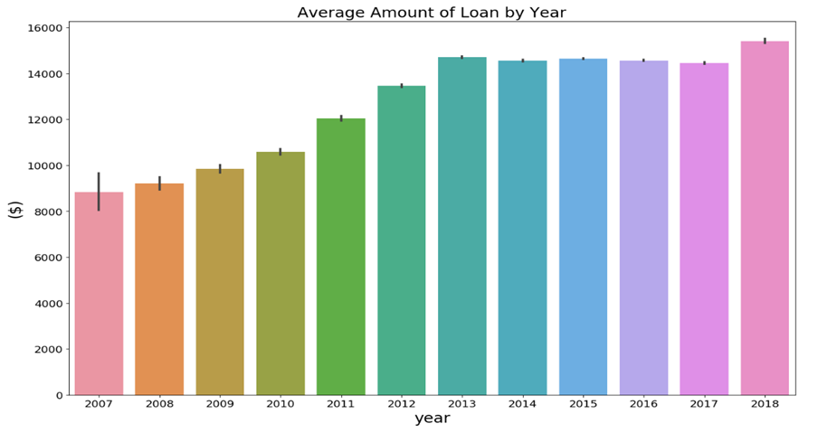 연도별 대출 금액 평균입니다. 연도가 증가함에 따라서 평균 대출 금액이 증가하는 것을 확인할 수 있습니다. 전반적인 물가 상승에 따라서 화폐단위가 커진 것이 큰 역할을 하지 않았나 예상해보았습니다. 또는 전체적인 금리 인하로 시중에 돈이 풀린 것도 있겠습니다.