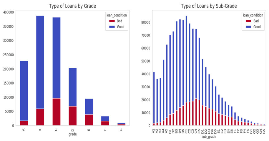 좀 더 상세하게 sub_grade(세부 신용등급)에 따라서 비율을 비교해보았습니다. 어느 정도 'A등급의 하위보다 B등급의 상위가 더 좋지 않을까?'라는 생각을 해보았지만 전혀 그렇지 않은 것을 확인하였습니다. 세부 신용 등급에 따라서 상환비율이 높은 것을 확인할 수 있습니다.