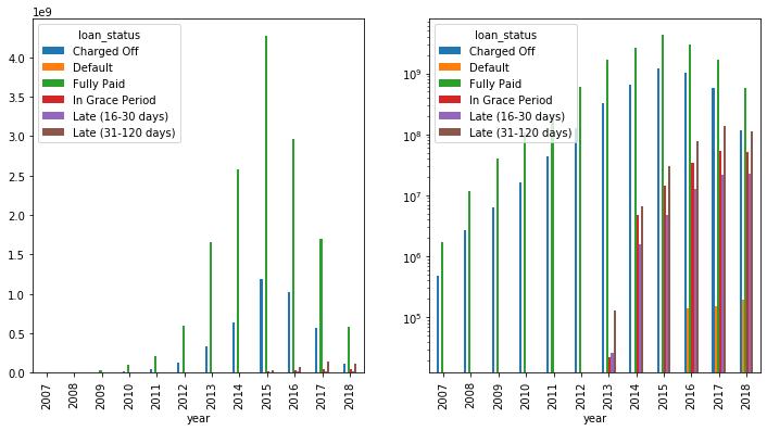 loans_by_grade.unstack().plot(kind='bar', stacked=True, colormap=cmap, ax=ax2, grid=False)