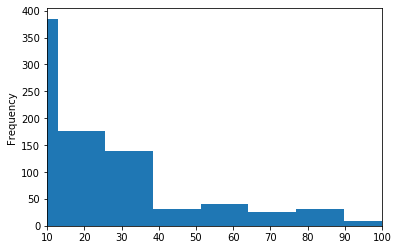 train_dummy['Fare'].plot(kind='hist', bins=40, xlim=(10,100))