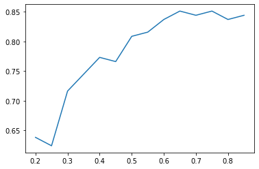 기준이 낮을 때는 정확도가 매우 낮다가 점점 올라가는 것을 확인할 수 있습니다. 이후 0.85 근처에서 더 이상 증가하지 않습니다.