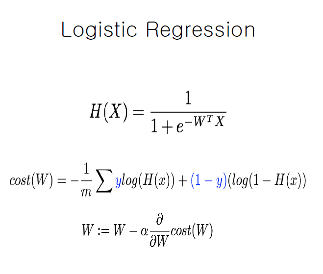 로지스틱 회귀 함수와 cost function은 위의 수식과 같이 나타낼 수 있습니다.