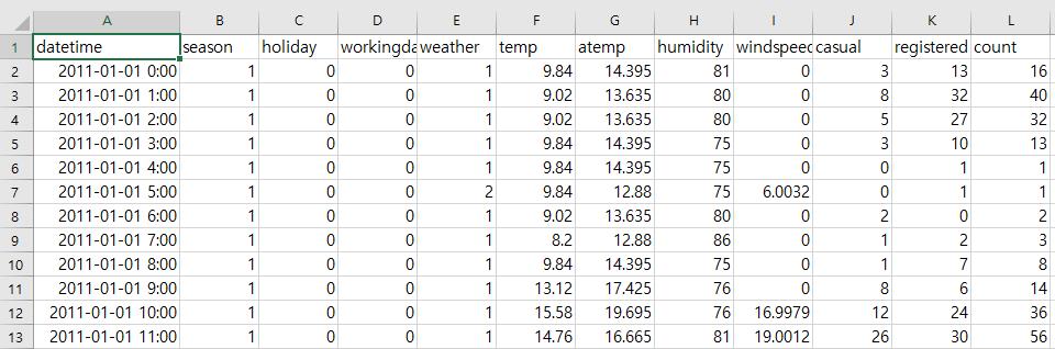 사람들은 한 장소에서 자전거를 빌려서 필요에 따라 다른 장소로 반납할 수 있습니다. 이러한 시스템에서 생성된 데이터는 이동 기간, 출발 위치, 도착 위치 및 경과 시간을 명시적으로 기록하기 때문에 연구자들에게 매력적입니다. 따라서 자전거 공유 시스템은 도시의 이동성을 연구하는 데 사용될 수 있는 센서 네트워크 역할을 합니다. 이번 대회에서 참가자들은 워싱턴 D.C.의 캐피털 바이케쉬 프로그램에서 자전거 대여 수요를 예측하기 위한 것입니다. 과거 사용 패턴을 날씨 데이터와 결합해서 몇 대의 자전거가 필요할 것인지 예측하여 확률을 도출하면 됩니다.