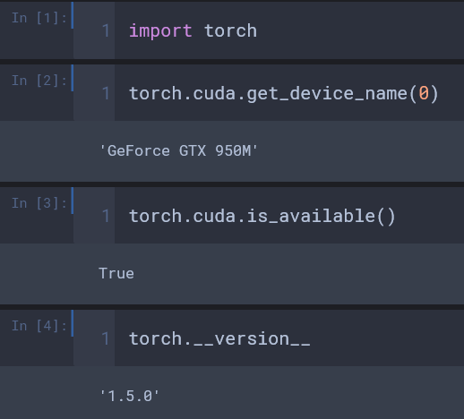 설치가 완료되셨으면 PyTorch가 잘 설치되어있는지 확인하시면 됩니다. 가난한 대학생인 저는 노트북 내장 그래픽카드 GeForch GTX 950M을 쓰고있습니다 ㅠㅠ 언젠가 저도 1080 ..또르륵.