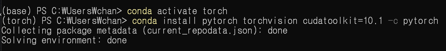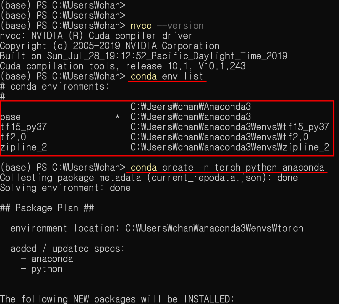 기본적으로 저는 가상 환경을 나누어서 작업을 진행하는 것을 선호합니다. 그래서 PyTorch를 사용하기 위한 env를 만들어서 진행하겠습니다. 기본 base 파이썬에 설치해도 무방합니다.