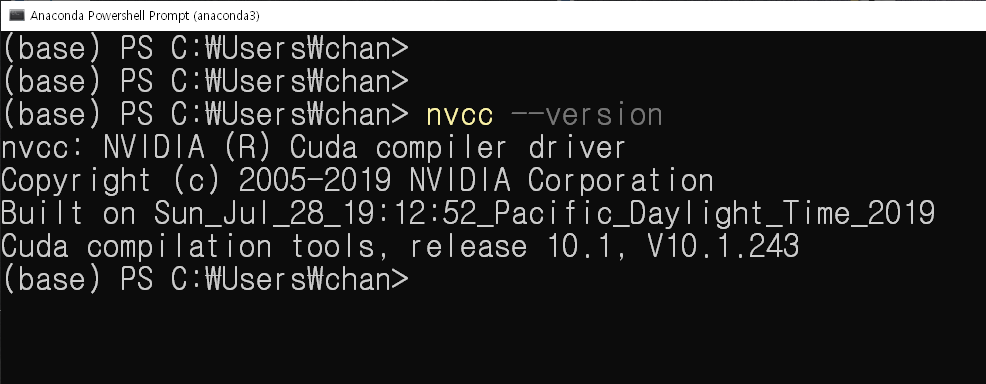 저는 최근에 tensorflow를 다시 설치하면서 10.1버전을 설치하였습니다. release 10.1 이라고 나오는 것을 확인할 수 있습니다. 혹시 CUDA가 설치되어있지 않다면 CUDA를 설치하셔야합니다.