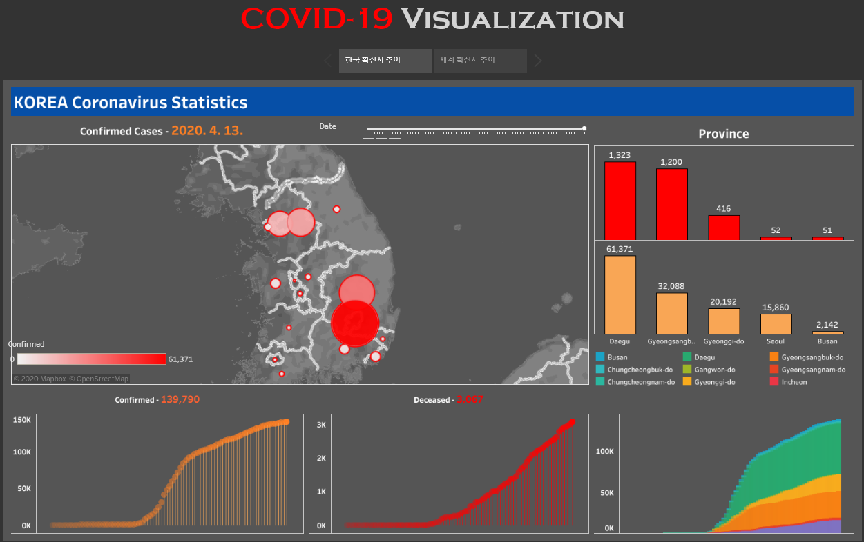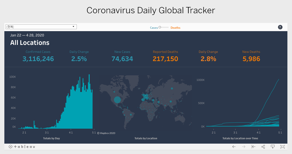 Tableau Public 주소 : https://public.tableau.com/profile/.12875783#!/vizhome/CoronavirusStatistics_15877072836610/1_1